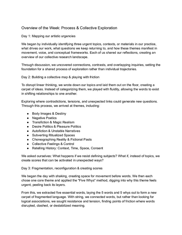 Some notes on the process of exploring individual urgencies, fragmentation, and shared meaning-making. Through cutting up language, mapping concepts, and connecting fragments with string, the group worked with friction and tension to generate new subjects. The process culminated in a participatory installation activating the research as an open, living space.