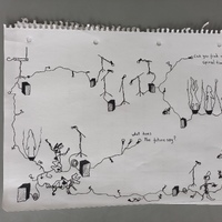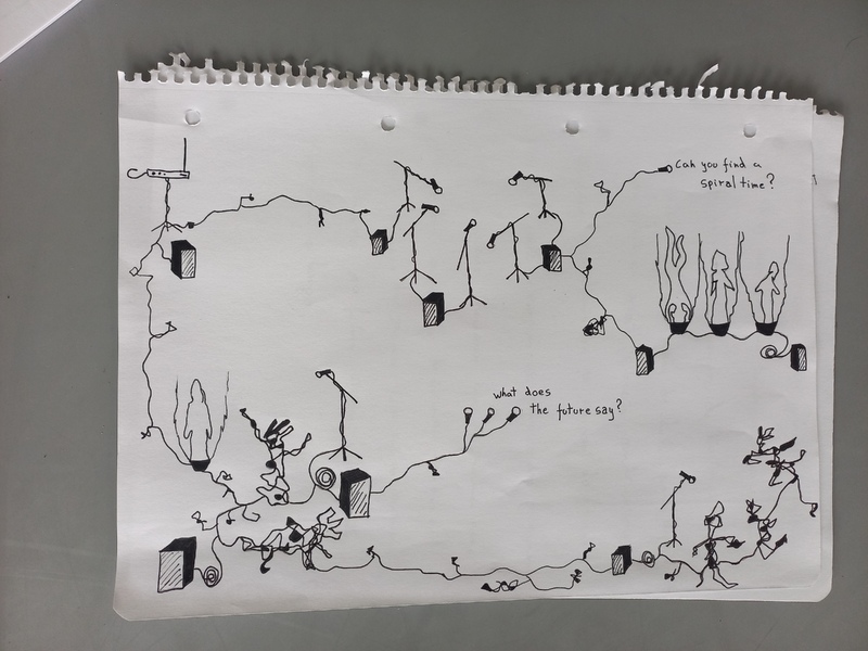 - en Drawing of my personal contribution to Tier 7, with sculptures, speakers, microphones, a theremin, holigrams and gaffer tape.