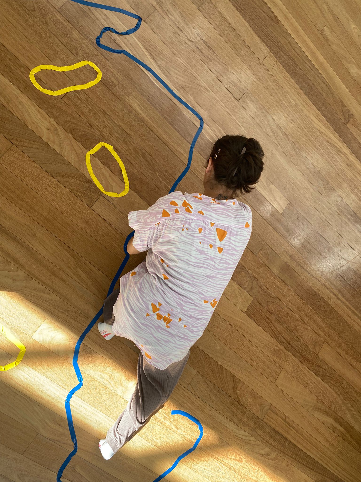 - en Sol improvising with Choreographic Lines of tape on the floor.