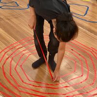 - en Aura improvising with Choreographic Lines of tape on the floor.
