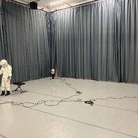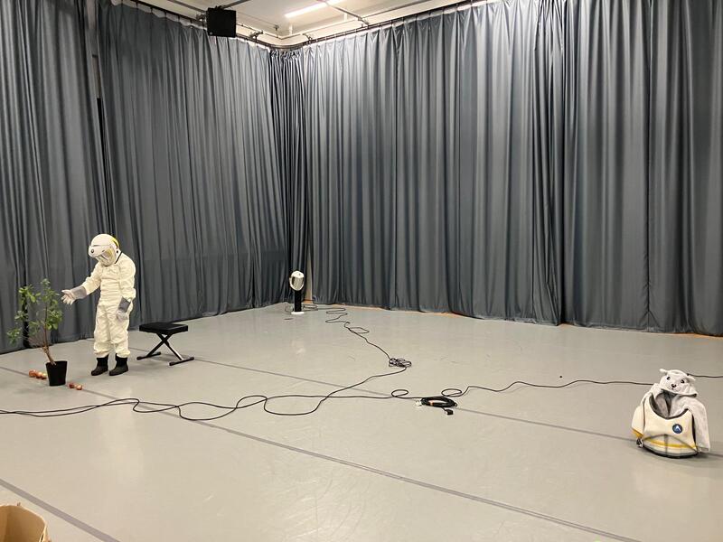 A composition of three astronauts. Electrical cables connect and isolate the space. The costume creates instant character, aloneness and needs. Two non-human characters are built out of a fan and helmet and a astronaut breastplate and children’s bear onsie. A human astronaut reaches to touch a live plant.