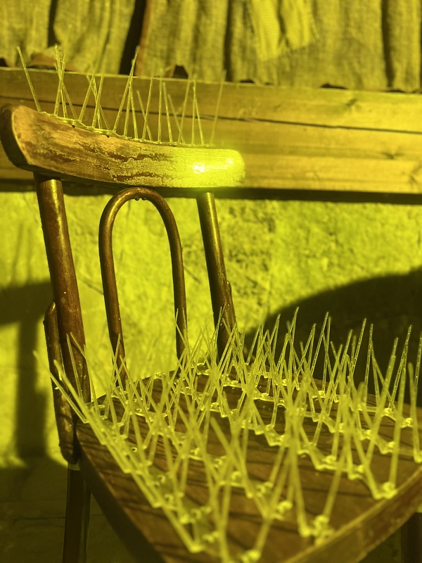 This is one of my latest works which I personally did two weeks ago and perfectly answers the theme of objects and arises many questions. This piece is part of voice installation but now I present it separately. As you can see here we have an old chair with anti bird spikes on it. I wanted to use everyday object and restrict person from using it in a very specific way. For me this work is a daily reminder of our modern agony, desperately trying to reach the very end moment in which you can breath out, seat back and relax, but it never comes as we are tied in this imaginative rat race of constant competition of reaching things. Also it can be linked to the main theme of the installation which is extinction. We as humans create environment which supports extinction of animals, birds and humans.