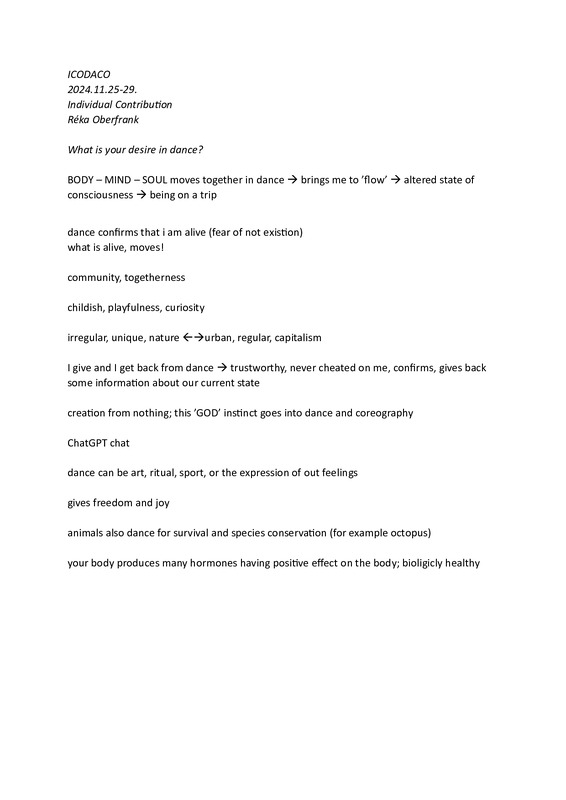 Besides the physical tasks we did during the week, I was constantly trying to go deepee into my thoughts about the motivation behind being a dancer. I also took some time to research why dance is beneficial for the body biologically and physically - what science says about it.