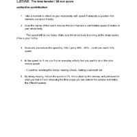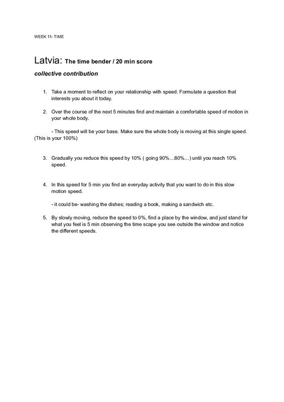 This score invites the mover to reflect on their relationship with speed through an embodied and guided practice. By slowing down the physical body it brings one’s attention to the variety of speeds around us. Through this practice we can become accutely aware of the details of everyday movement.