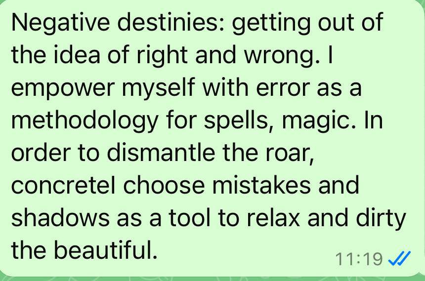 A poetic refusal of right and wrong, embracing error, shadow, and imperfection as creative forces. This project uses mistakes as spells, disruptions, and acts of empowerment, dismantling order and allowing chaos, magic, and uncertainty to shape new possibilities. By choosing what is messy and unexpected, the work “dirties” the beautiful and liberates imagination.
