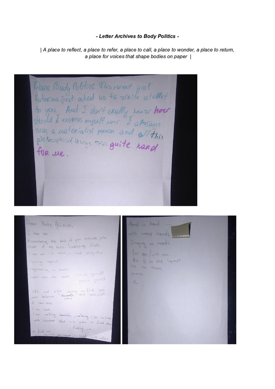A collective writing and accumulation of letters as a reflective response to the theme. By addressing the letters to ‘Dear body politics’ ,we sought to personalize the abstract, to bring the distant closer, and to question the systems that shape and claim ownership over our bodies. Through this approach ‘body politics’ became a lived and felt inquiry rather than a concept itself. A written, shared, and archived body held within a community of people