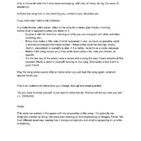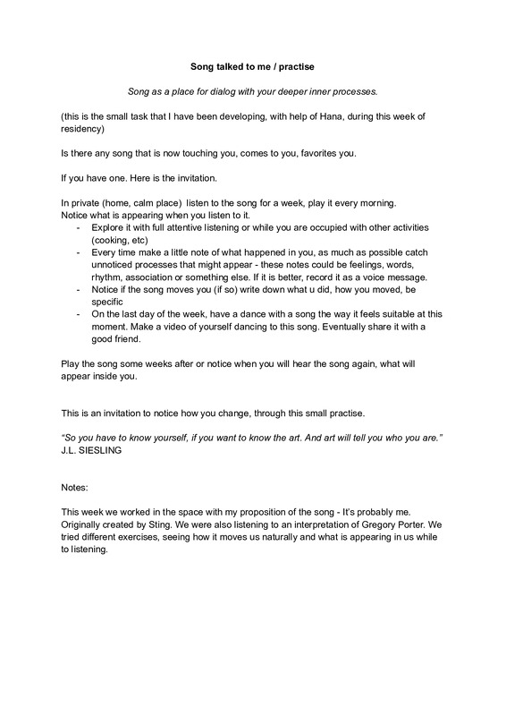 This week we worked in the space with my proposition of the song It’s Probably Me, originally created by Sting. We were also listening to an interpretation by Gregory Porter. We tried different exercises, observing how the song moves us naturally and what appears in us while listening. By playing with listening and with changes in our attitudes towards it, I tried to develop a simple task-proposition for someone else -"song talked to me" This relates to how songs can communicate with us and how our attitude while listening shapes what we receive.