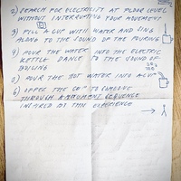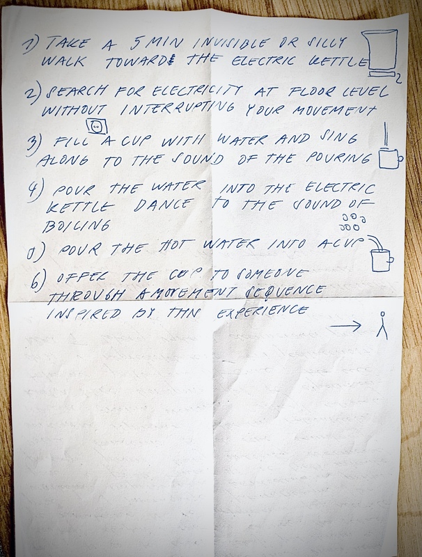 - en A performative score based on the process of making tea, in which each step is accompanied by a specific movement or vocal action, linking everyday activity with bodily and sonic performance.