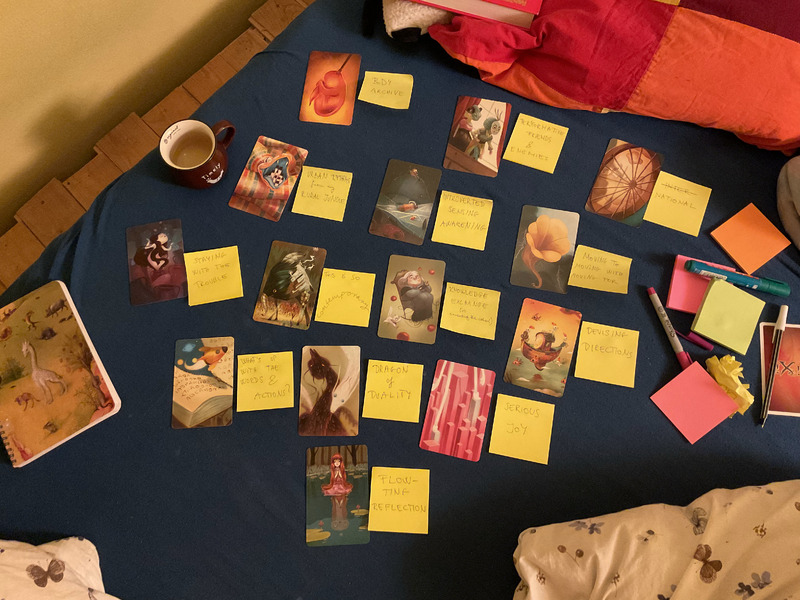 After the first residency week I sat down for a reflection session with myself using Dixit cards to reverberate some concepts that we co-created while talking about our visions of our future horizontal collaboration and while thinking about my own desire in dance. The reflection went like picking a card, seeing if it evokes a memory of the week or using my notes to find connections and in case it echoed, I labeled it with a concept.