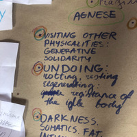A scribbled-on list of 3 themes that matter to me, while I realize there is only one theme - the body. Visiting the pre-verbal realms and seeing what appears. I find it a confusing place to be though, since my first form is language and poetry, and dance is my way to expand that, and yet, we need to return back to the abstract level in order to communicate.