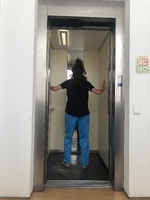 Mercedes embodying Glitch Manifesto to engender Fear, Uncertainty, Doubt Following my exercise on artistic manifestos, Mercedes chose to read and embody the Glitch Manifesto and created an action in which she was playing with the lift opening and closing to represent feelings