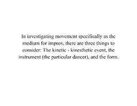 In investigating movement specifically as the medium for improv, there are three things to consider: The kinetic - kInesthetic event, the instrument (the particular dancer), and the form. Starter to think about