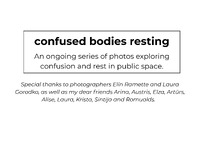 Confused Bodies Resting Confused Bodies Resting is an ongoing series of photos exploring confusion and rest in public space. Bodies are tired, bodies are confused and they decide to rest on the side of a road or in a tree. Or maybe it’s just confusing for those who are passing by?