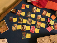 Tentacular Reflection Cards After the first residency week I sat down for a reflection session with myself using Dixit cards to reverberate some concepts that we co-created while talking about our visions of our future horizontal collaboration and while thinking about my own desire in dance. The reflection went like picking a card, seeing if it evokes a memory of the week or using my notes to find connections and in case it echoed, I labeled it with a concept.
