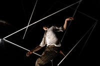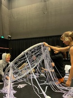 Web prop/set/costume An exploration of how sting material from an old scenography can be repurposed in a new way. The elastic bands were weaved around the circle to create a both malleable and firm structure.