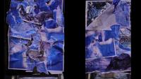 Research of set ideas This video documents an ongoing research into collage as a live, temporal structure on stage. On a 3x3 meter surface, layered materials and images are placed, built up, and then collapsing through water. Falls reveals another image, shifting the composition and recalling what has already disappeared. The process is less about permanence than about transformation: the stage becomes a site where time performs through the gradual disintegration of layers. In the end, the collage empties itself, leaving only a blank surface.